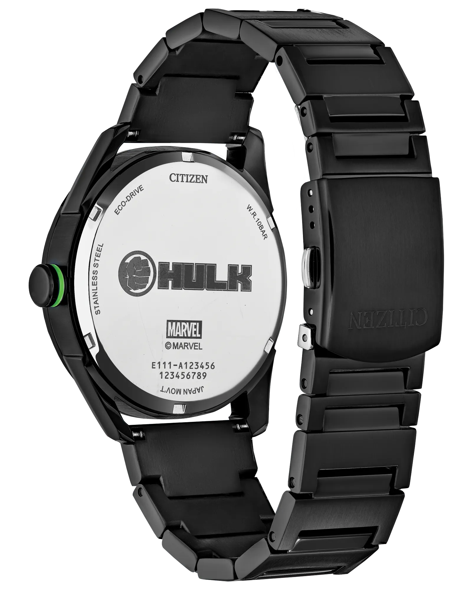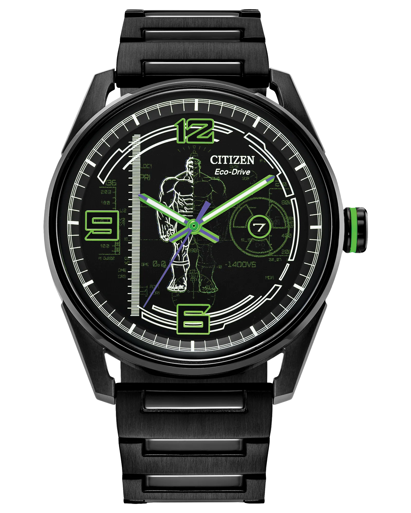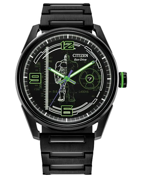 Evergreen favourite the Hulk is a smash on this new watch showcasing the mild-mannered science genius Dr. Bruce Banner, whose alter-ego is the rage-fueled Avenger. The black dial centers the Hulk in a classic pose anchoring green lume-filed hands and a purple second hand and surrounded by abstractions of the gamma rays that initially transformed him into the super-sized, super-strong Goliath, while the gamma ray icon surrounds the date window. The sturdy 42mm case and bracelet are crafted from black IP stainless steel, and the case back is etched with his logo and his mighty fist. Another sign of strength? This watch is sustainably powered by any light with our Eco-Drive technology and never needs a battery. © 2025 MARVEL
