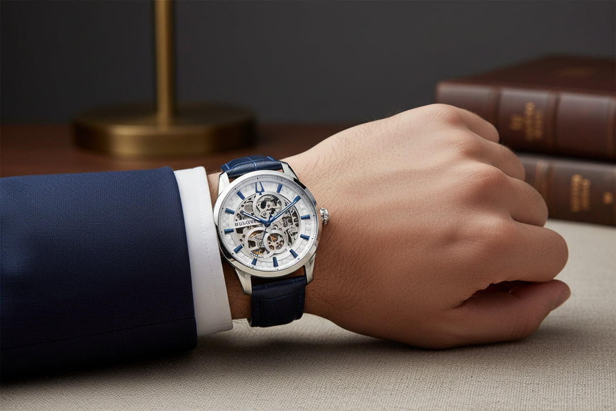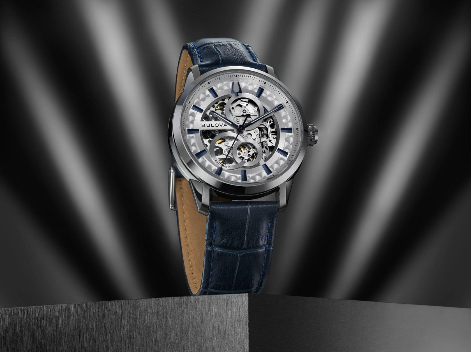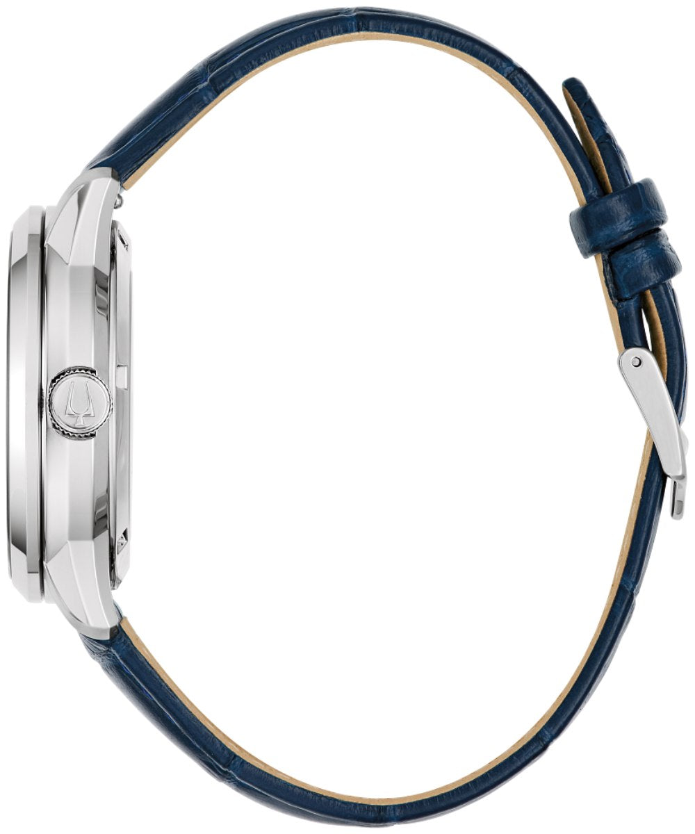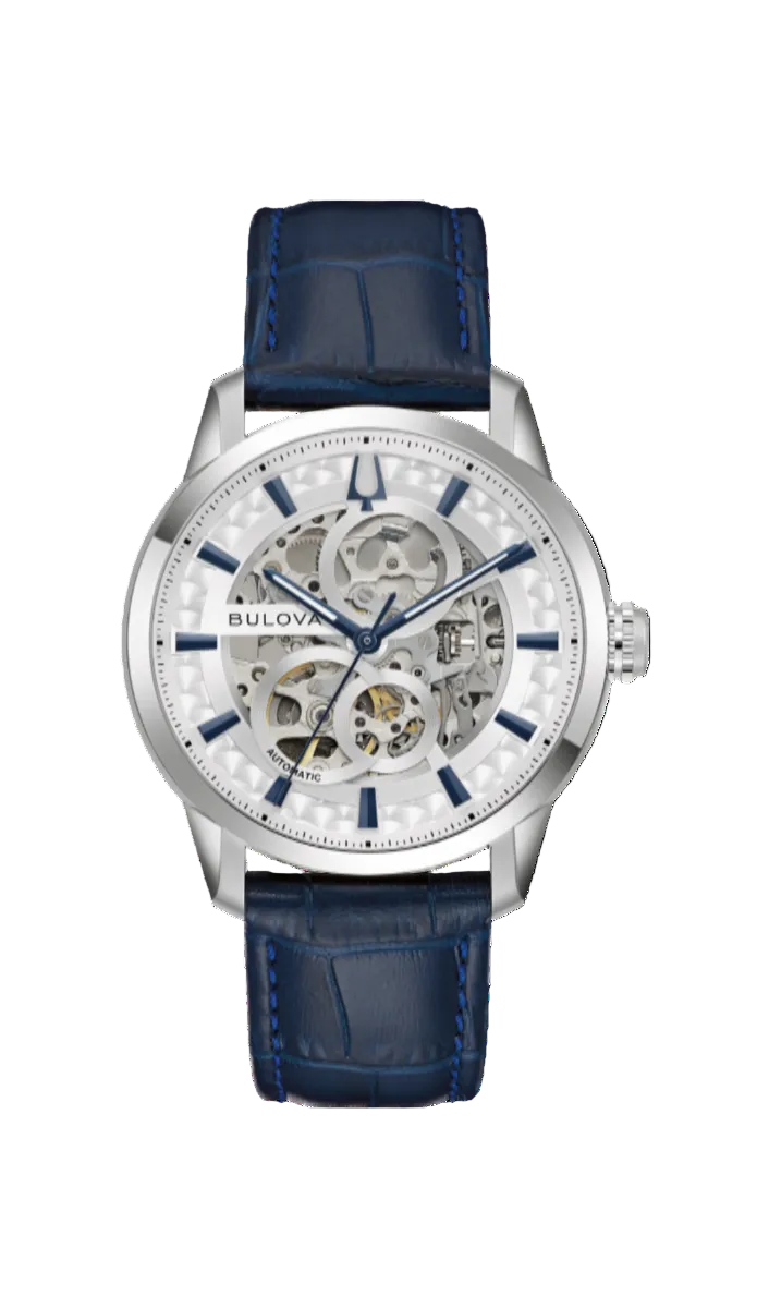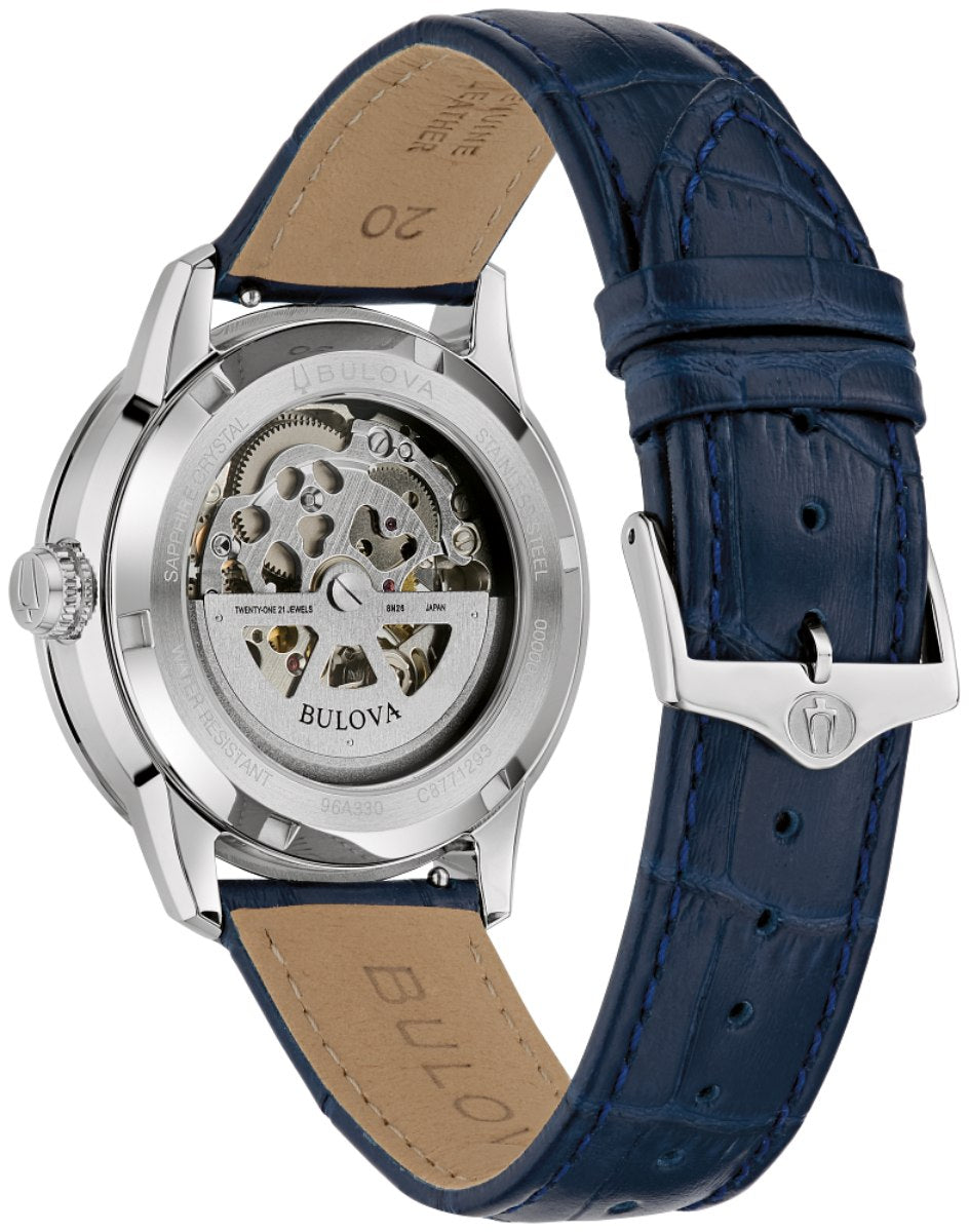 Experience wonder with a Bulova men’s Sutton Automatic timepiece that shows off its complex inner workings. Sculptural and organic, the dynamic silver-tone stainless steel case features a blend of finishes to create a striking presence on the wrist, with a sapphire crystal ensuring optimal clarity. Multilayered and blending complementary finishes, the openworked dial is set with applied blue indices and matching hands with luminescent fill. The dial reveals the captivating mechanics of the 21-jewel skeletonized automatic movement, which offers 42-hours of power reserve. Completed with a blue alligator-embossed leather strap, this Bulova men’s watch is the perfect choice to elevate your style.
