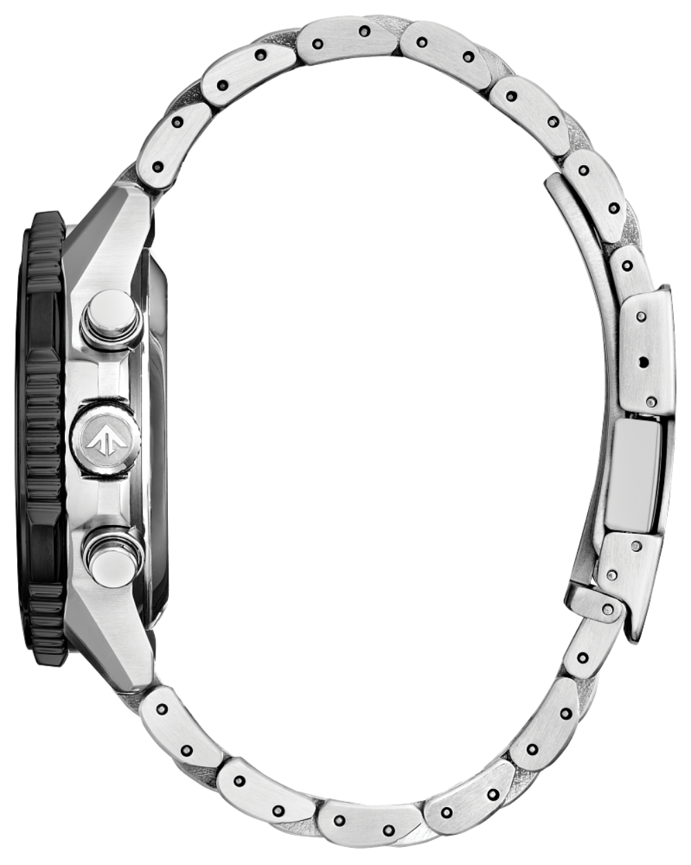 With advanced technology paired with an incredibly bold look, the latest Promaster Air Navihawk reaches a higher altitude in style. The watch's silver-tone stainless steel case measures 40mm in diameter, wearing boldly with its sharp faceting and satin finishing, while a slide-rule scale on the bezel provides additional flight utility. A triple-link stainless steel bracelet secures the timepiece to the wrist.