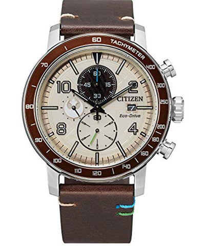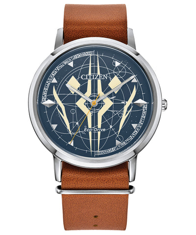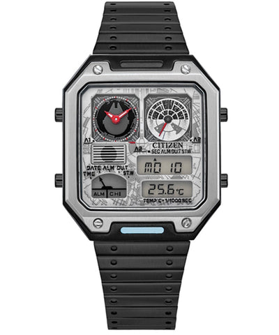 The array of features on the R2-D2 inspired watch from the Star Wars™ | Citizen Tsuno Collection will make you just as resourceful as the astromech droid himself. The silver-tone stainless steel case reflects the design of R2-D2, as does the dial, which has a raised look echoing his panels, and is accented with Artoo’s™ distinctive blue and red details. The sub-dial at the 6 o’clock position also has a miniature R2-D2 detail, and the watch sports a 1-second chronograph, a date display, and a silver-tone stainless steel bracelet. The classic Star Wars logo is etched on the case back, along with an intricate image of the dutiful droid. This exciting collection features 4 timepieces, each with a vintage design inspired by Citizen’s iconic 1972 model known as the Tsuno Chrono, thanks to tsuno “horns” placed on both sides of the 12 o’clock position. This watch uses a battery.