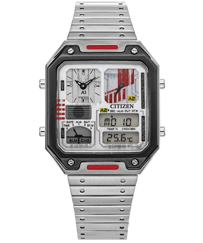 - The new watch is an update to a previous Ana-Digi model and inspired by an original Citizen analog-digital watch from the 1980s. This time, we’re introducing sleek screw details on the bezel, a black stainless-steel bracelet in a new tapered style, and a footprint of 33.4mm in width by 45.4mm in length.