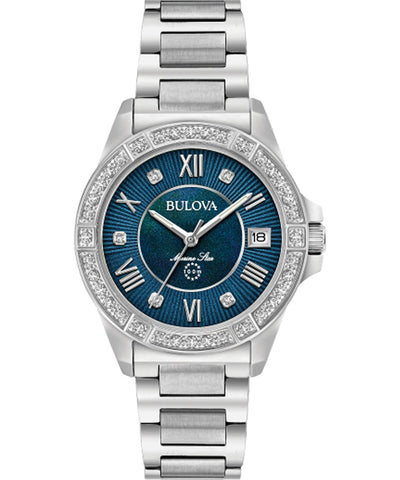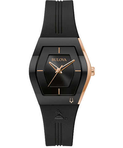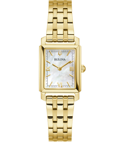 Bold, elevated design characterizes this Classic Bulova Prestige women’s timepiece that balances bold design with an elegant presence. The watch features a faceted 32mm gold-tone stainless steel case with a geometric bezel, flat sapphire crystal with anti-reflective coating, 100m of water resistance, and a chamfered 3-link bracelet with brushed and polished finishes and a push-button deployant closure. The lustrous mother-of-pearl dial has gold-tone hands and applied markers with Super-LumiNova luminescent fill and a date display. Striking in both its modernity and its sophistication, this Bulova ladies’ watch is an ideal companion on any wrist.
