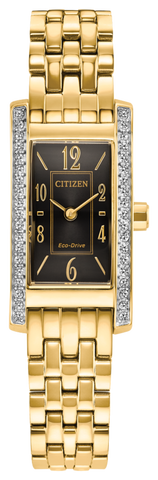 From the Rubaiyat Collection. Legendary heritage reinvented in a gold-tone stainless steel case with synthetic blue spinel cabochon crown at 12 o’clock position and eight diamonds individually hand set on textured silver-white dial, double curved sapphire crystal, gold-tone stainless steel bracelet with double-press deployant closure, iconic dye struck “Goddess of Time” dimensional case back, and water resistance to 30 meters.