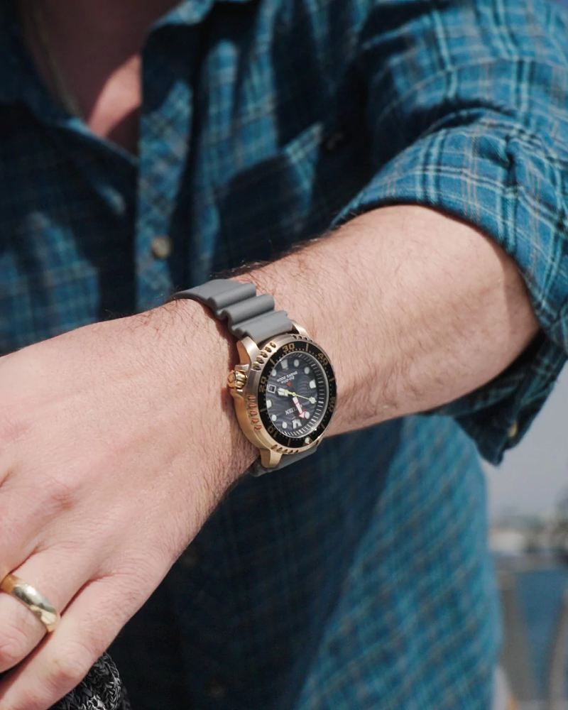 Explore the deepest depths with the latest Promaster Dive in a stylish new colour. This must-have diving watch vibrantly features a rose gold-tone stainless steel case, a grey 3-hand dial with date function, and luminous hands and markers. The durable, grey polyurethane strap with buckle closure completes the look for a comfortable fit. Featuring our sustainable Eco-Drive technology powered by any light that never needs a battery, you’ll wear this high-performance timepiece in high style from adventures on land to the deep blue sea. ISO compliant and water resistant to 200 meters. Calibre E168.