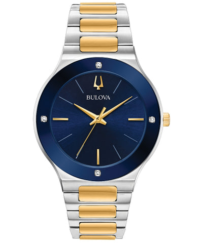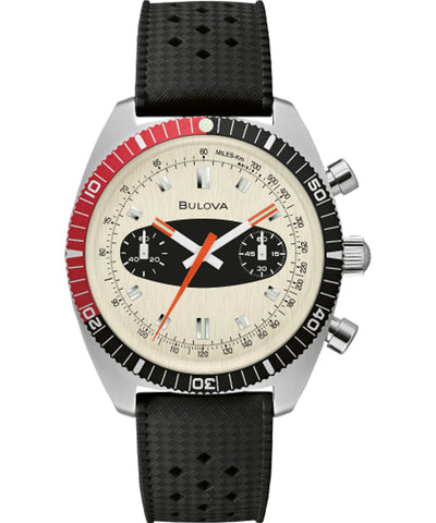 A style inspired by history, the Chronograph A is a nod to the popular styles from Bulova’s diver chronographs from the 1970s. This style was popularly known as the “Surfboard” for the distinctiv oval “surfboard” encircling the two sub dials. This updated version features a stainless steel case with blue and red accents and a blue dial. The dial features the notable oval in white around the sub dials, as well as red tipped hour and minute hands, luminous hands and markers, and a red chronograph second hand. Five-hand chronograph quartz movement, domed sapphire crystal with anti-reflective coating. Blue perforated silicone strap with deployant closure. Water resistance to 200 metres.